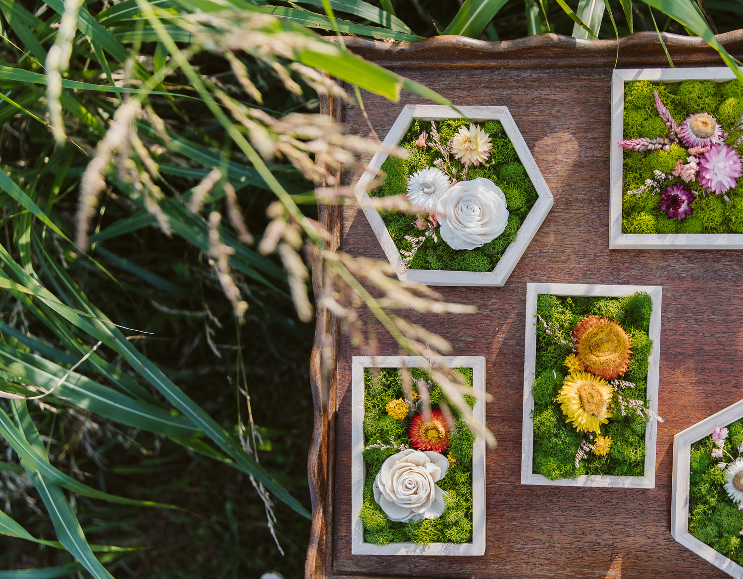 Let loose and glue your moss and flowers in any design that speaks to you! If it helps, you can consider color and contrast, as well as height and depth, in your process of building out your piece.