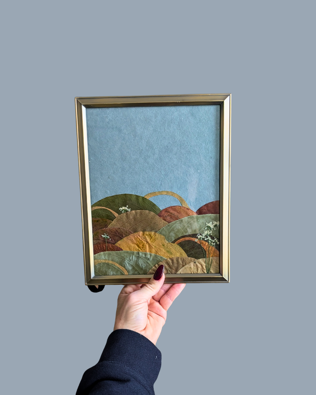 It's been a while since I worked on a leafscape - my pressed leaf collection was overflowing and it felt like time. I remain inspired by the seemingly endless shades of color that can be found in nature. These scraps of leaves are arranged on handmade paper, set in a reclaimed gold picture frame.