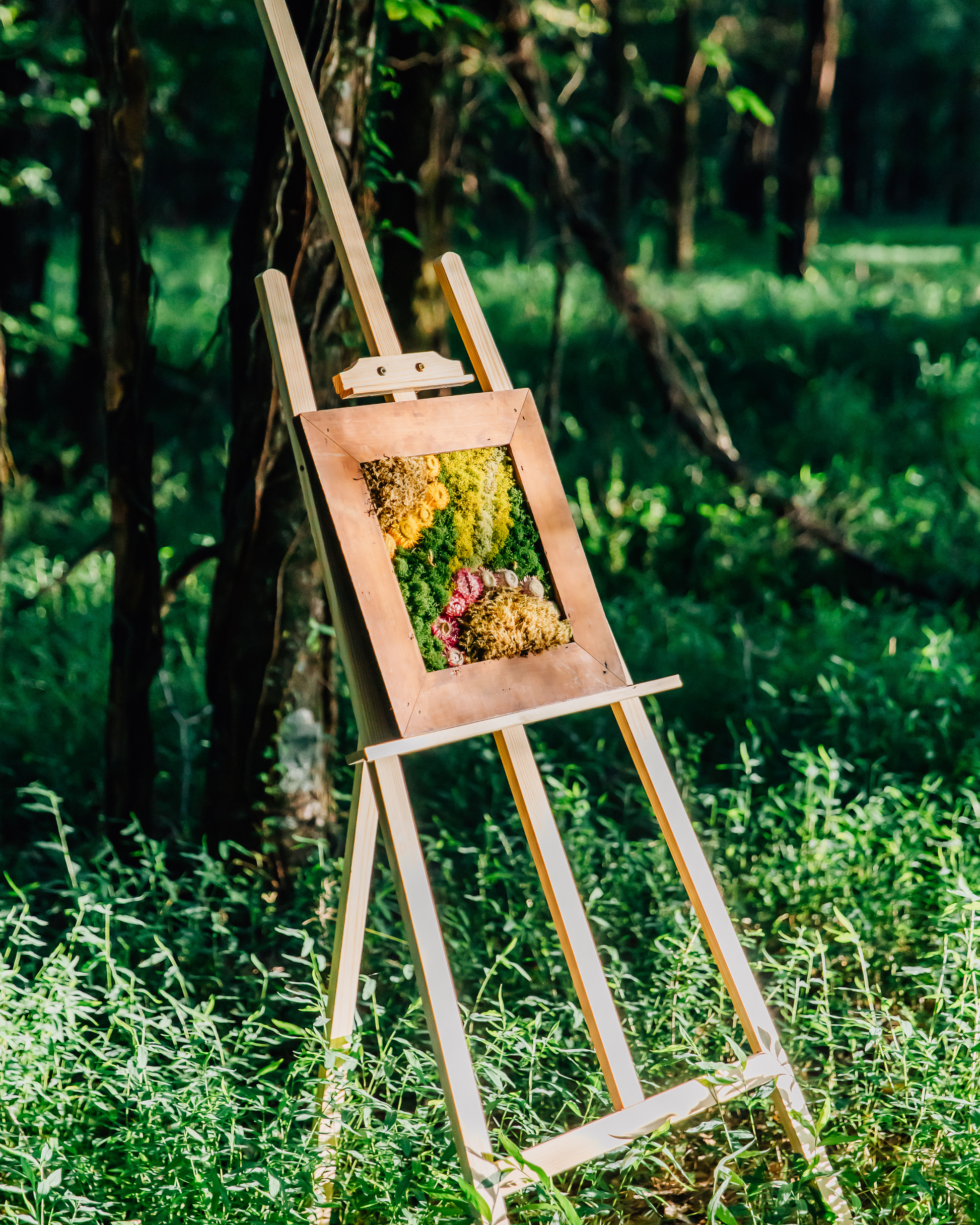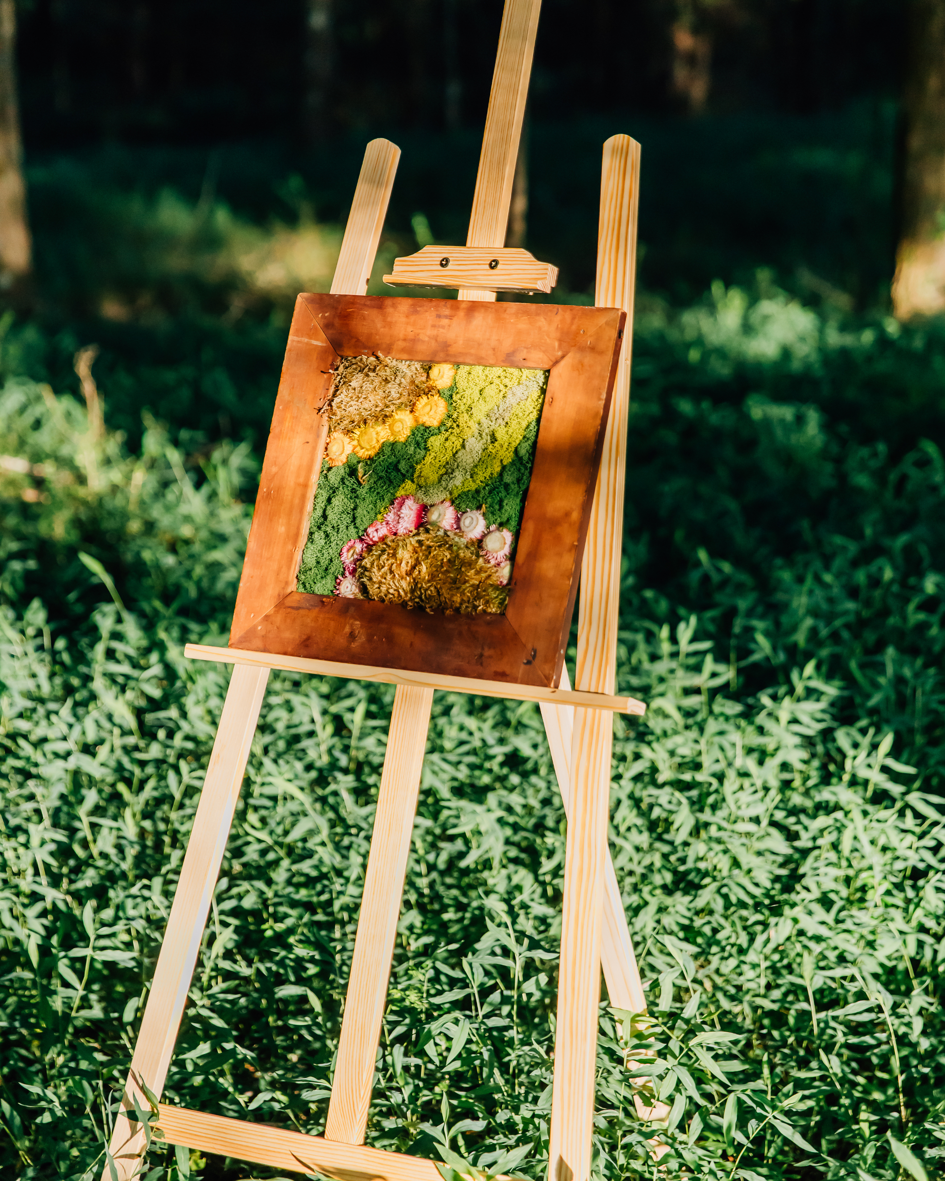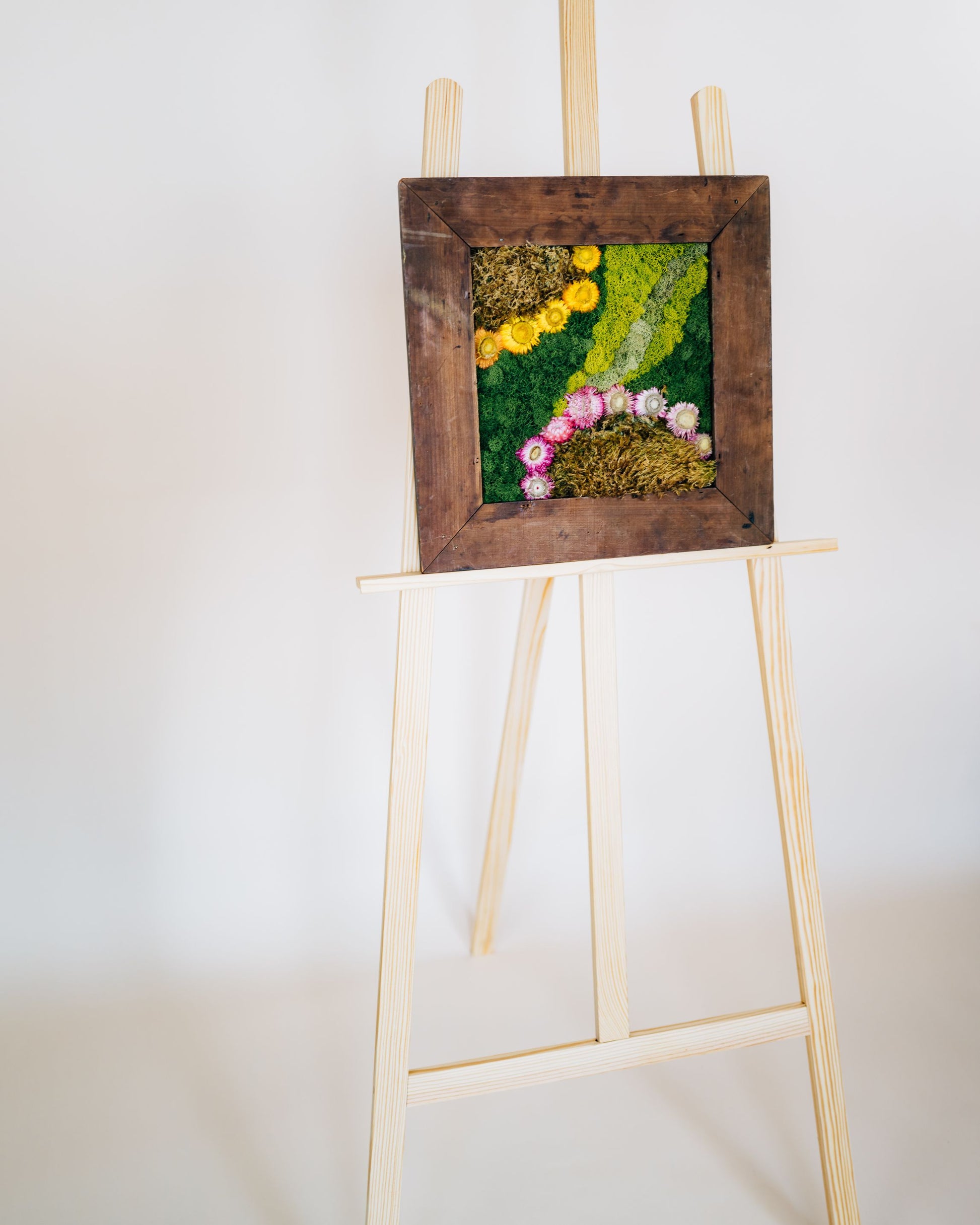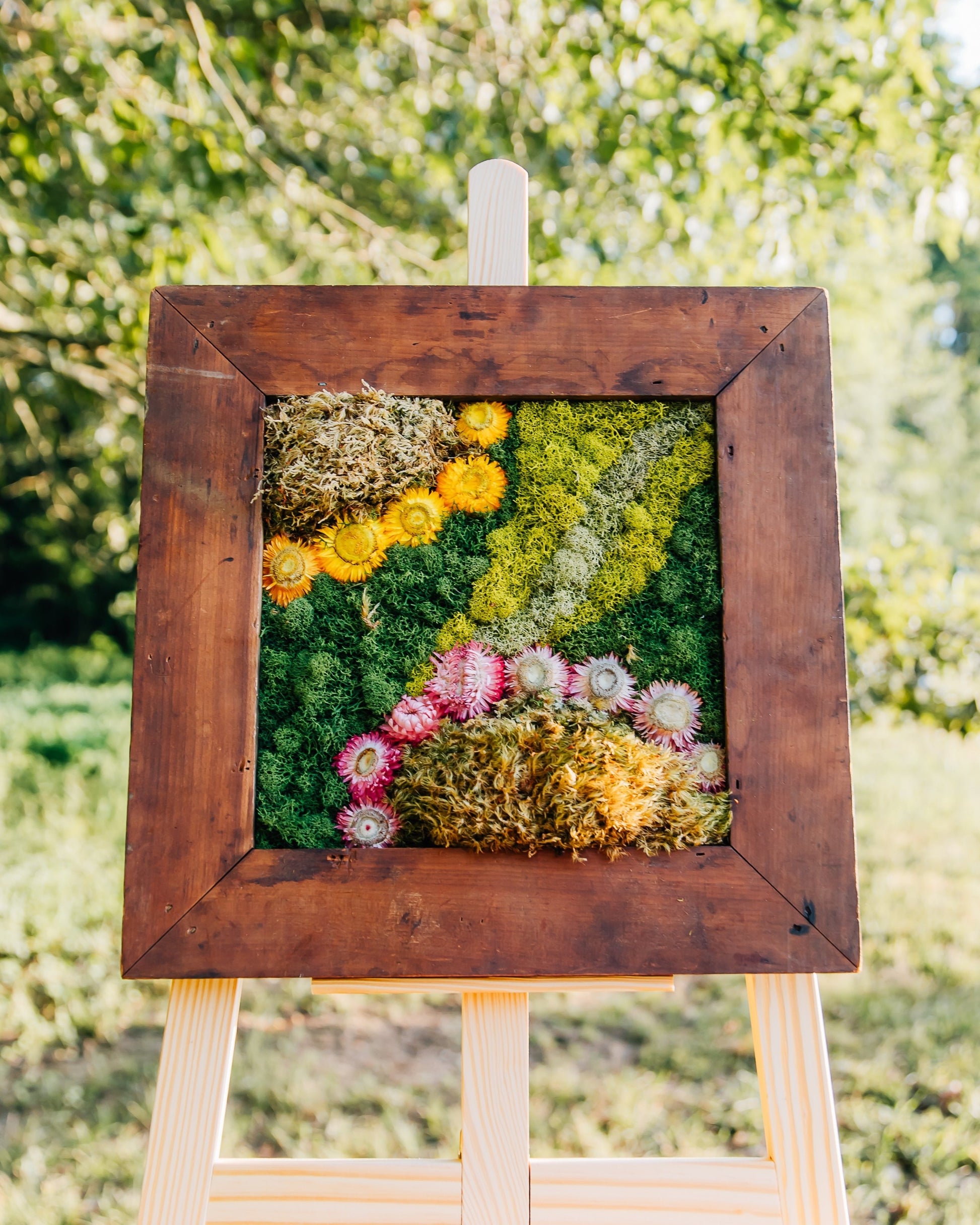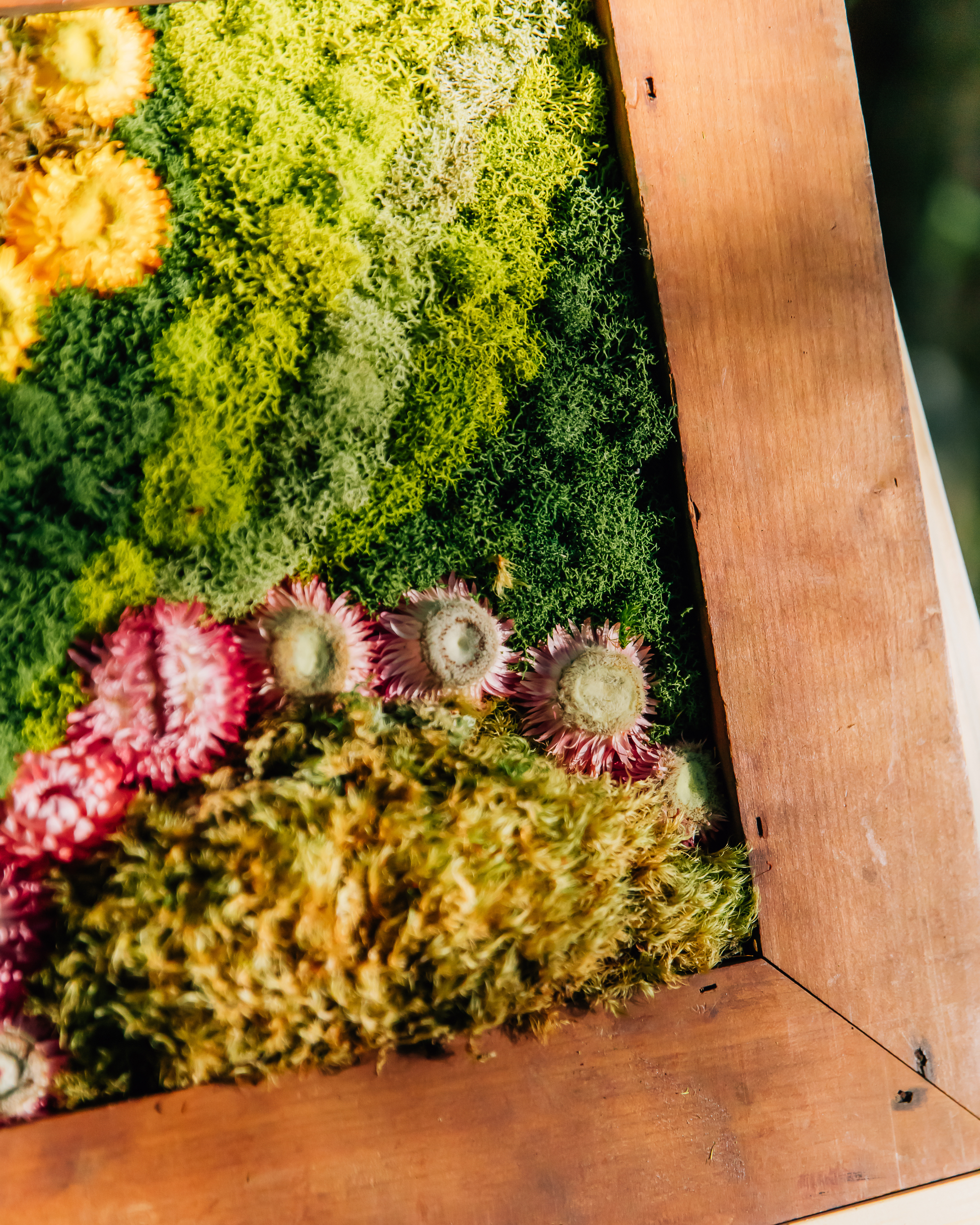 Preserved moss with dried strawflowers set in a reclaimed picture frame